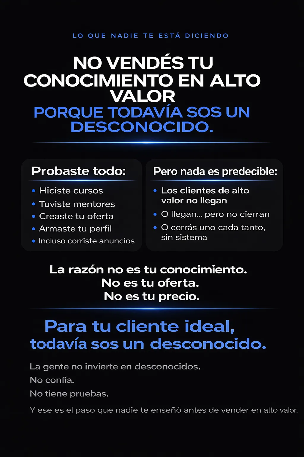 No es que seas desconocido. Es que sos desconfiable. Acá vas a entender por qué tu audiencia no compra — aunque te siga, te respeto, y sepa lo que haces — y qué es lo único que cambia eso antes de intentar vender algo caro.